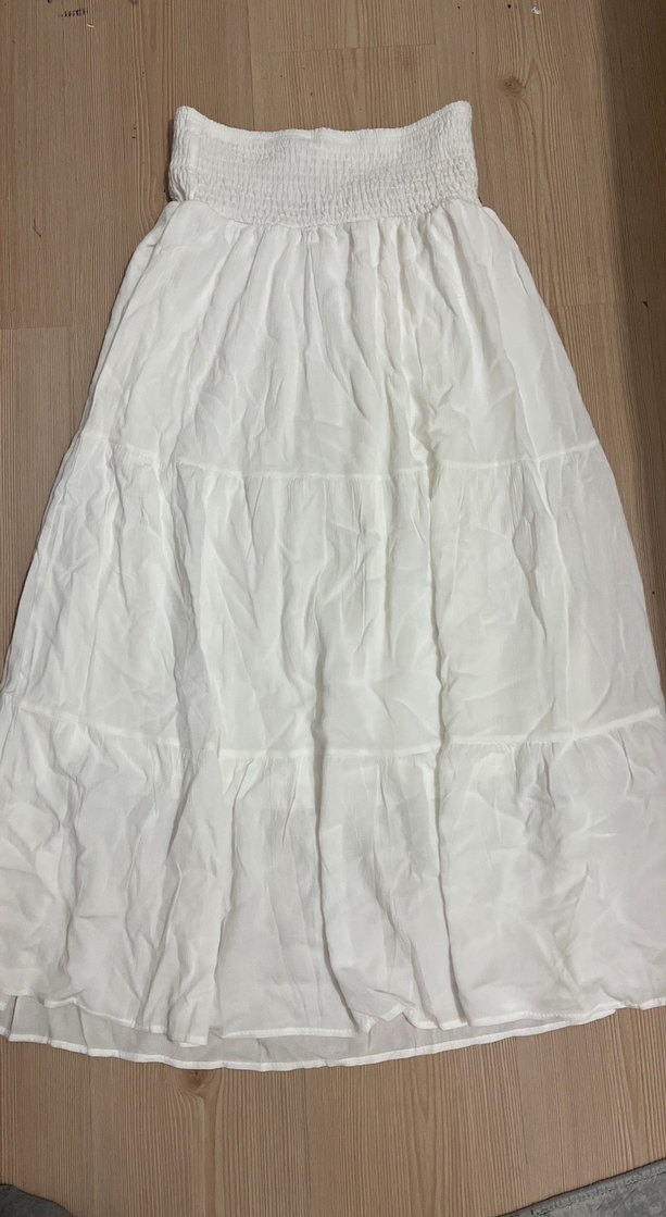 Beyaz keten kumaştan, uzun boylu ve fırfırlı detaylara sahip, bol kesim bohem tarzda etek.