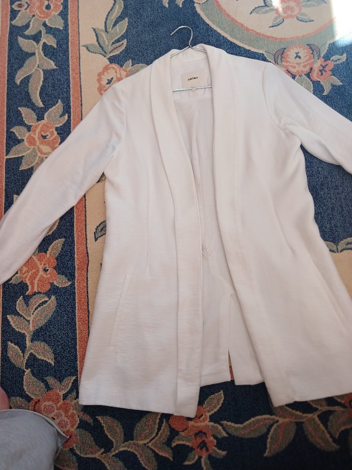 Uzun boy, beyaz keten kadın blazer ceket, yakası kesik ve düğmeli. Uzun kollu ve regular fit, günlük rahat sokak stili için uygun.