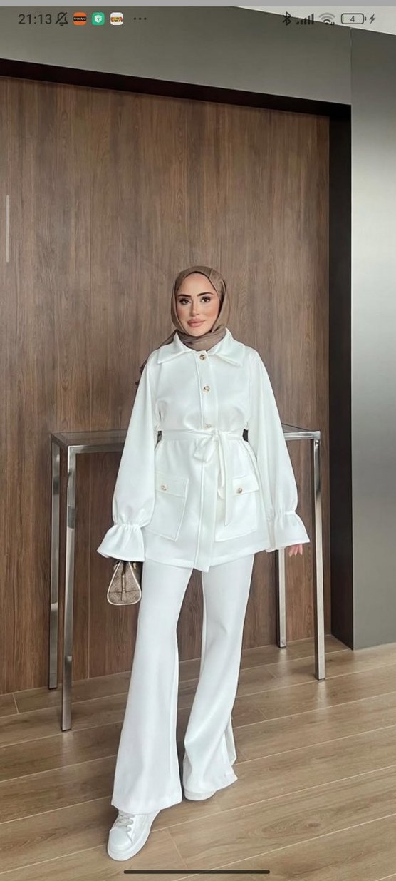 Beyaz renkte, uzun kollu ve regular fit kadın takımıdır. Yakası kesimli ve belde bağlamalıdır. Günlük kullanıma uygundur.