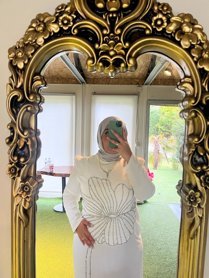 Beyaz tie-dye desenli, uzun kollu ve boğazlı, hafif sentetik kumaştan transparan detaylı, dar kesim Esnek kumaş. Minimalist tarzda günlük kullanıma uygun.
