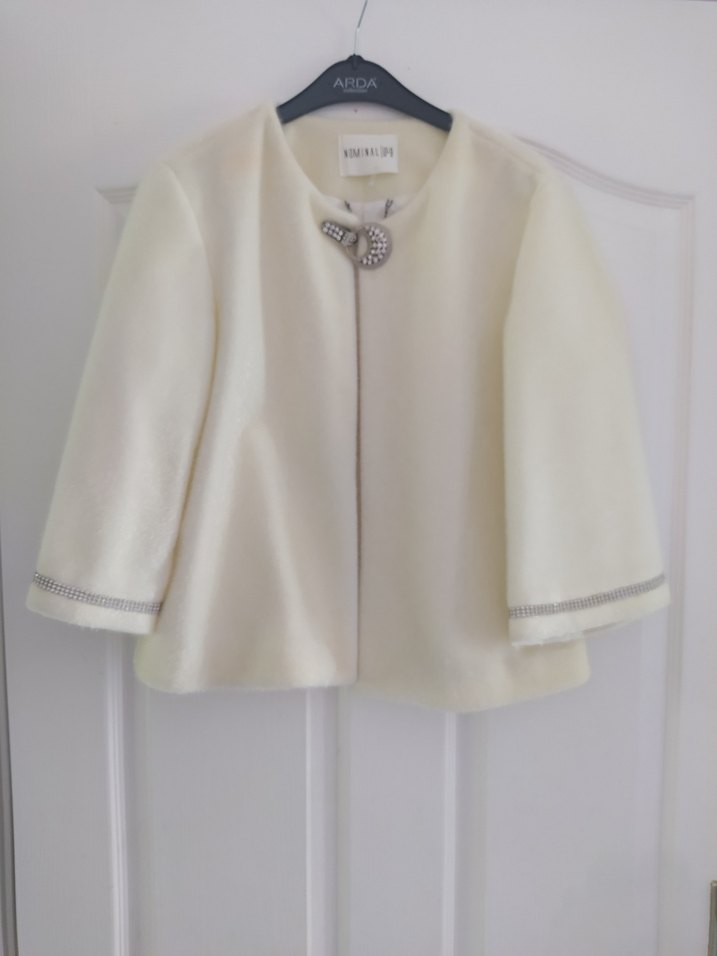 Beyaz, uzun kollu bolero, işlemeli ve parlak detaylara sahip, düğmeli ön kısmı ve modern klasik kesimiyle şık bir seçenek.