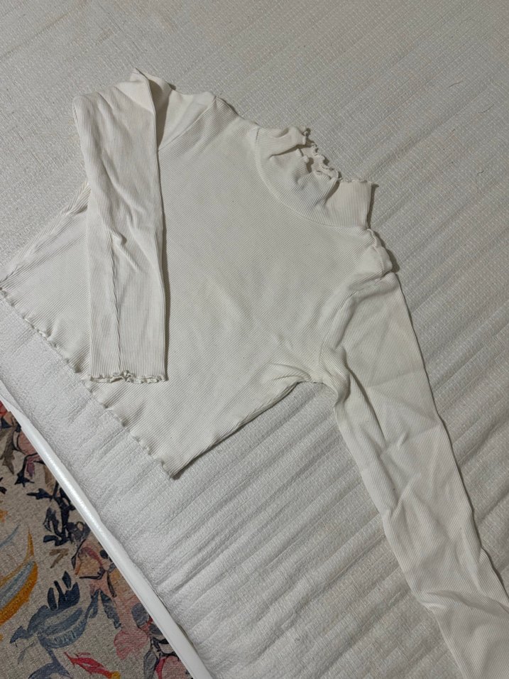 Uzun kollu, balıkçı yaka ve ince kesime sahip beyaz crop. Düz ve sokak stili görünümü sunar.