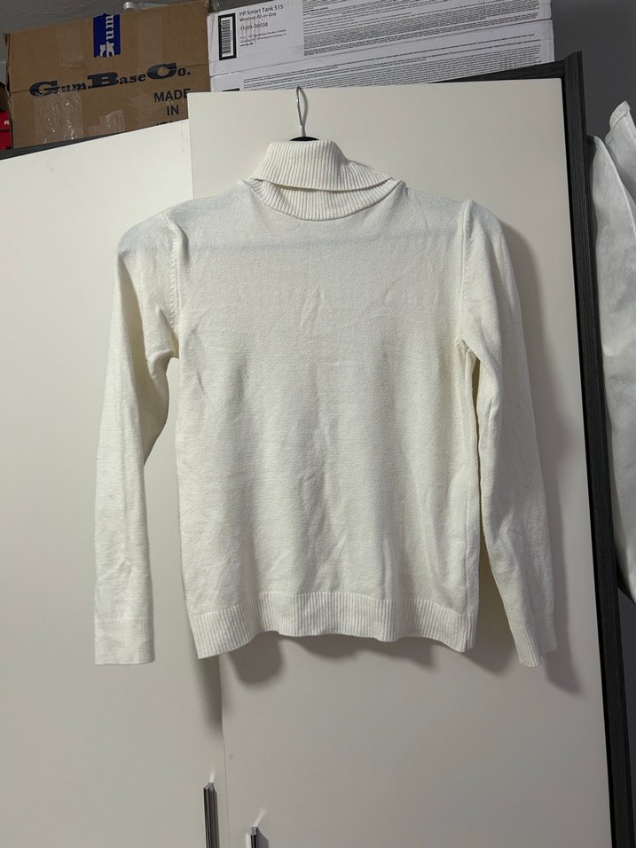 Beyaz, uzun kollu, balıkçı yaka kadın kazak, ince keten kumaştan, sade ve şık, günlük kullanım için uygun.