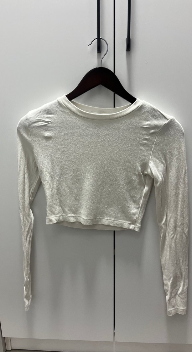 Beyaz, uzun kollu, yuvarlak yakalı kadın crop body. Yumuşak kumaştan, sade ve minimal tasarımlı, günlük sokak stili için uygun.