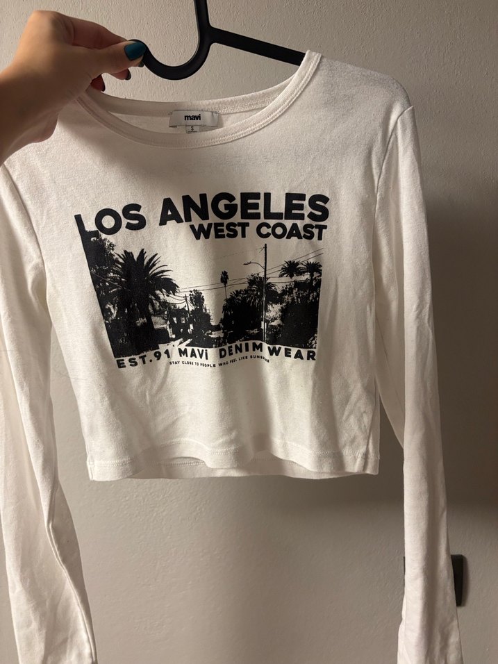 Beyaz uzun kollu, bol kesim ve yuvarlak yaka tişört. "LOS ANGELES WEST COAST" yazılı baskısı ve palmiye ağaçları ile pamuk kumaştan üretilmiştir.