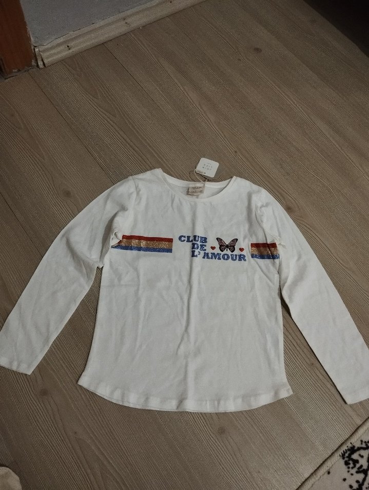 Pamuklu, beyaz uzun kollu kız tişörtü, bol kesim ve yuvarlak yaka ile. Üzerinde renkli baskılar ve "CLUB DE L'AMOUR" yazısı bulunur. Düğme detaylıdır.