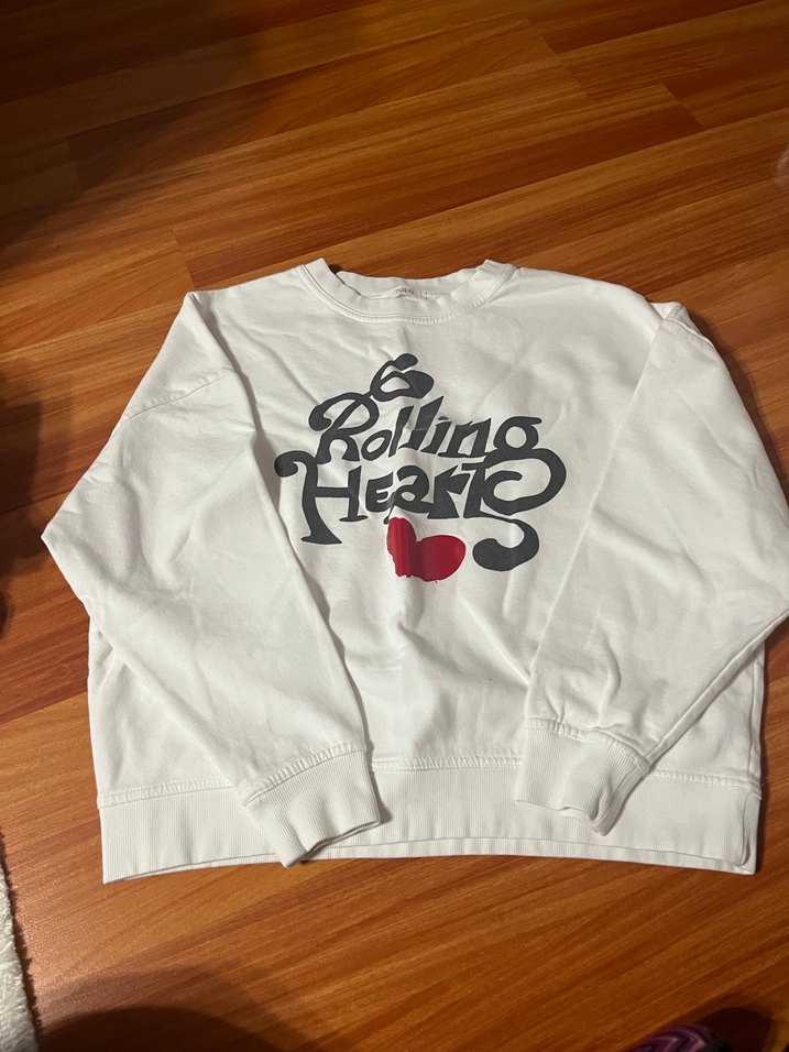 Yumuşak pamuklu kumaştan, uzun kollu ve bisiklet yaka beyaz sweatshirt. Baskılı tasarım ve fırfır detayıyla rahat kesim, günlük kullanım için uygun.