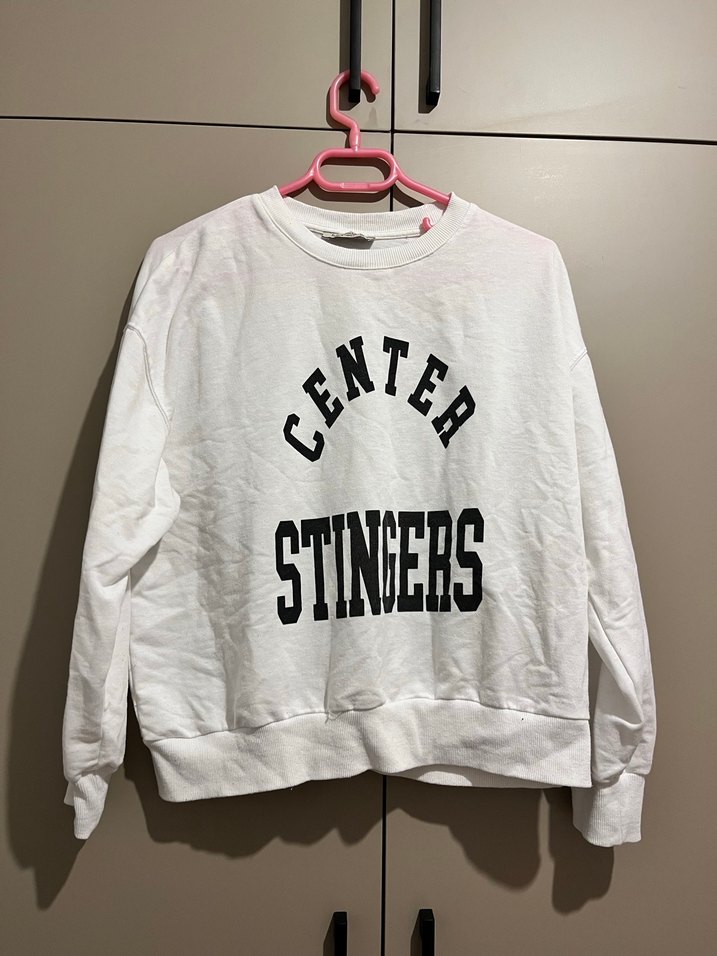 Pamuklu beyaz sweatshirt, uzun kollu ve yuvarlak yakalıdır. Baskılı "CENTER STINERS" yazısı ile spor ve rahat bir tarz sunar.