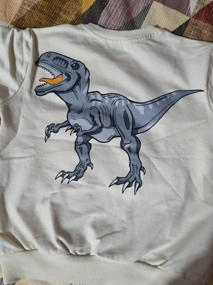 Baskılı "DINGSAUR" yazılı beyaz, uzun kollu, rahat kesim sweatshirt. Yumuşak ve sıcak kumaştan, günlük rahat stil için uygundur. Sırtında dinozor baskısı var. Yumuşacık bir kumaşı var. #çocuk #erkekçocuk #tesettür #şal #eşarp #kreş #okul