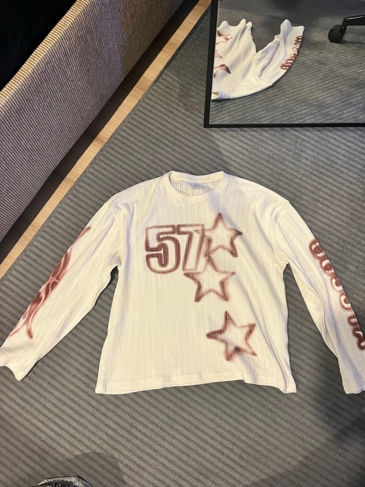Beyaz renkli, uzun kollu, yuvarlak yaka ve bol kesim tişörtü. Pamuklu örme kumaştan, 57 ve yıldız baskılarıyla sokak stiline uygun. ✨