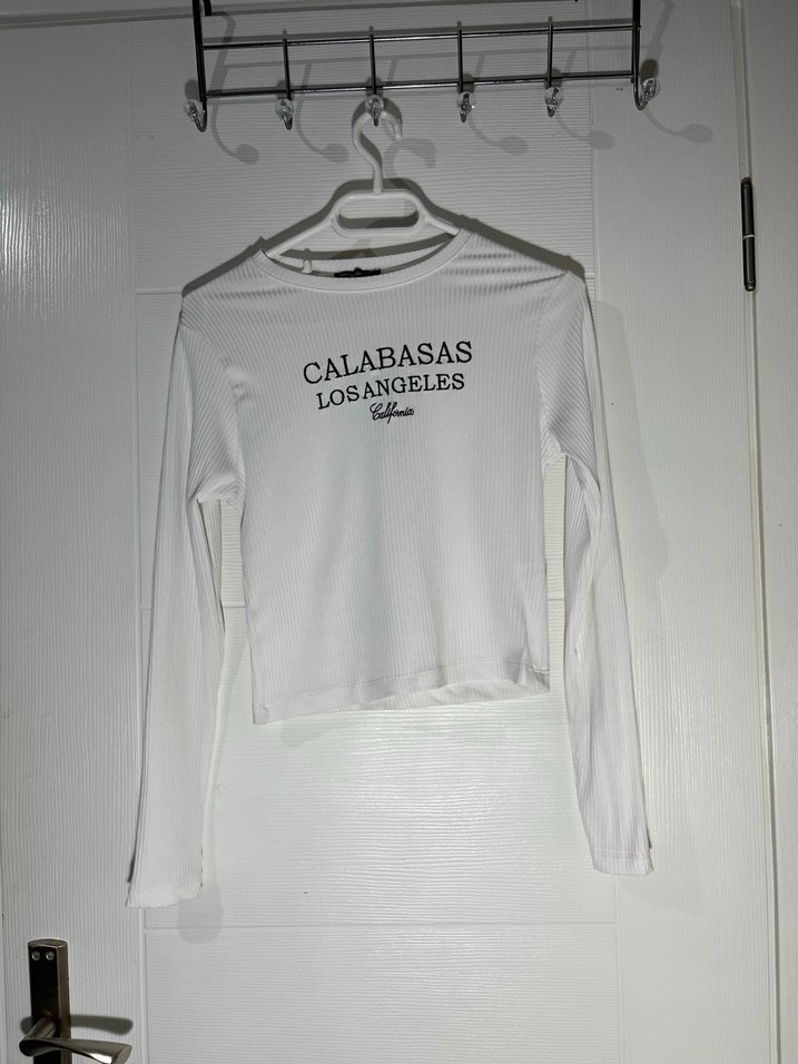 Pamuk kumaştan, uzun kollu ve bisiklet yakalı, vücuda oturan beyaz kız çocuk tişörtü. "CALABASAS LOS ANGELES" yazılı gri baskısı ile şık ve rahat bir sokak stili sunar.