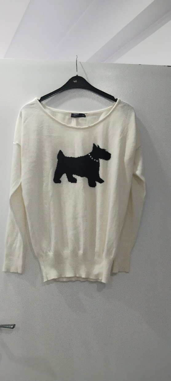 Beyaz renkte, uzun kollu, yuvarlak yakalı, bol kesim triko kazak. Ön yüzünde siyah köpek baskısı bulunur, rahat sokak tarzı için uygundur.