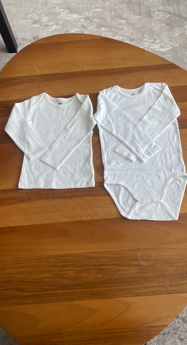 Yumuşak kumaştan yapılmış beyaz uzun kollu bebek atlet ve body, sade ve açık renklidir. Üst üste giymek için uygundur.