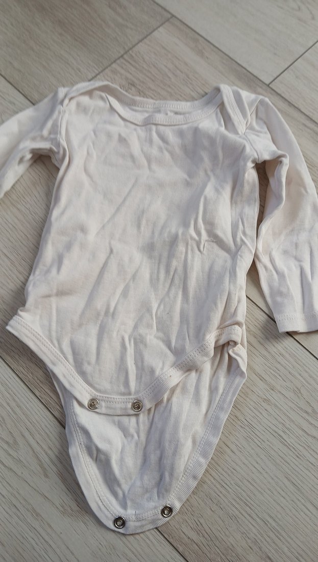 Beyaz renkli, uzun kollu, yuvarlak yakalı, yumuşak kumaştan yapılmış bebek body. Rahat ve sade tasarım.