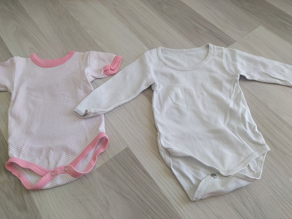 Beyaz renkli, uzun kollu, düğmeli ve yuvarlak yakalı bebek kız body. Pastel tonlarda, desensiz rahat bir tasarım. iki adet