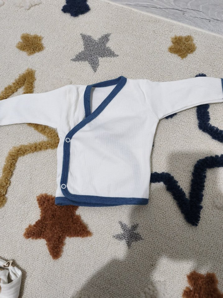 Mavi şeritli, düğmeli beyaz uzun kollu bebek zıbını. Yumuşak ve sıcak kumaştan, V yakalı, sade tasarımlı.