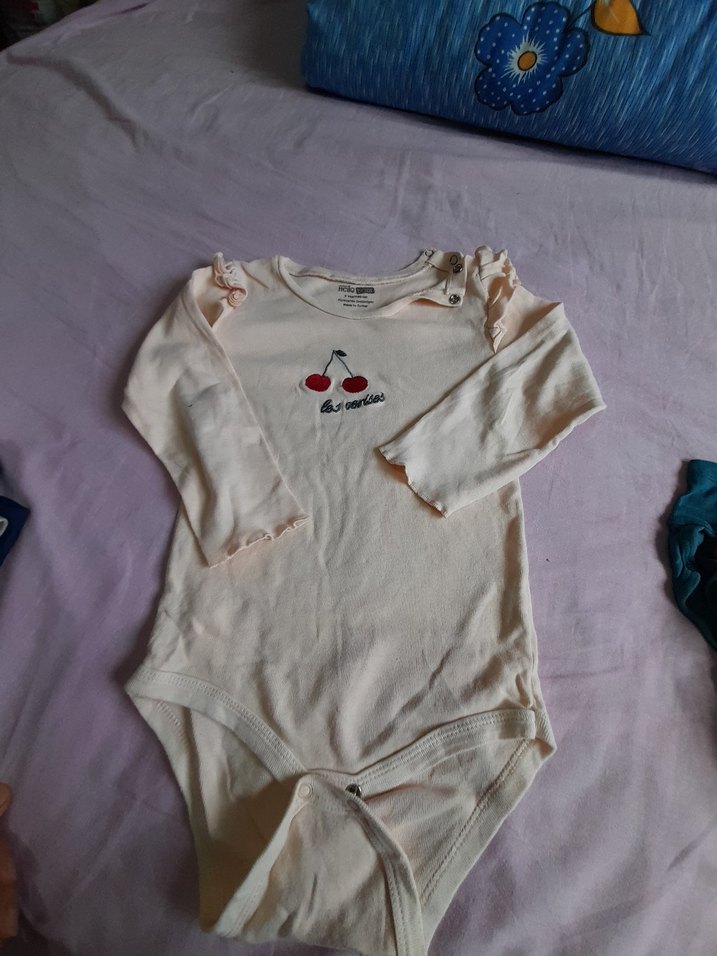 Beyaz, uzun kollu bebek zıbını, yuvarlak yaka ve yumuşak kumaş ile küçük kiraz desenine sahiptir. Kolay giydirme için çıtçıtlıdır.