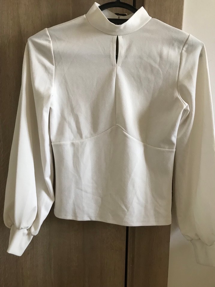 Yüksek yakalı ve uzun kollu beyaz bluz