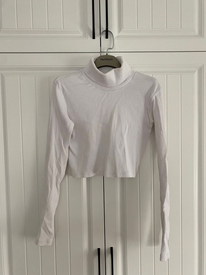 Bu beyaz, uzun kollu, yüksek yakalı triko, yumuşak keten kumaştan yapılmıştır. Minimalist tasarımı günlük rahat sokak stiline uygundur.