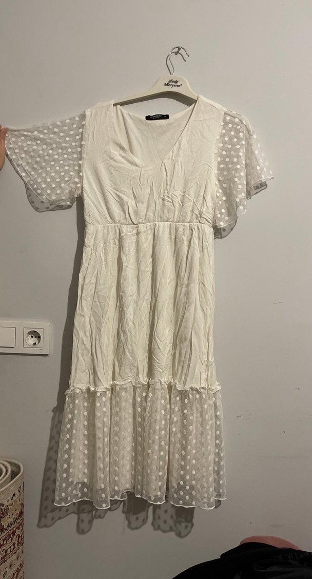 Bu beyaz bohem elbise, V yakalı ve fırfırlı detaylara sahip bol kesimdir. Kısa, transparan puantiyeli kolları ve yumuşak keten kumaşı vardır.