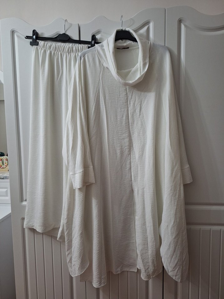Bu beyaz hamile tunik, bol kesim, uzun kollu ve yüksek yakalıdır. Yumuşak keten kumaştan yapılmış olup, minimal ve bohem tarzda zarifçe dökümlüdür. Günlük kullanım için uygundur.