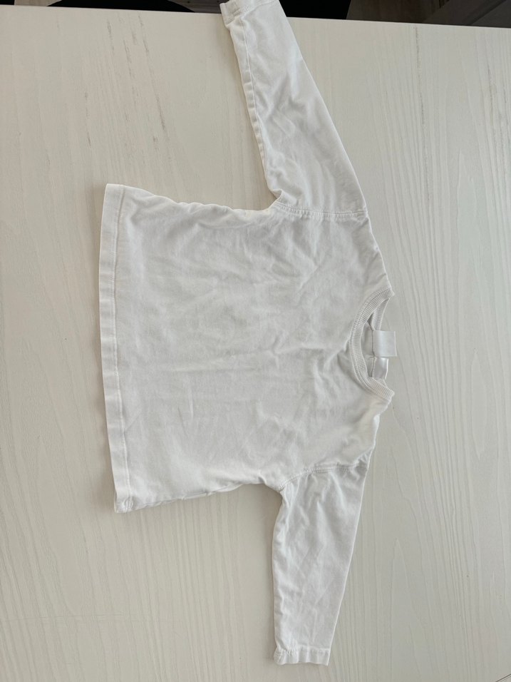 Yumuşak kumaştan yapılmış, düz beyaz uzun kollu çocuk atleti. Rahat ve sade tasarım, günlük kullanım için uygundur. Ufak sarı bir boya lekesi var gösterdim.