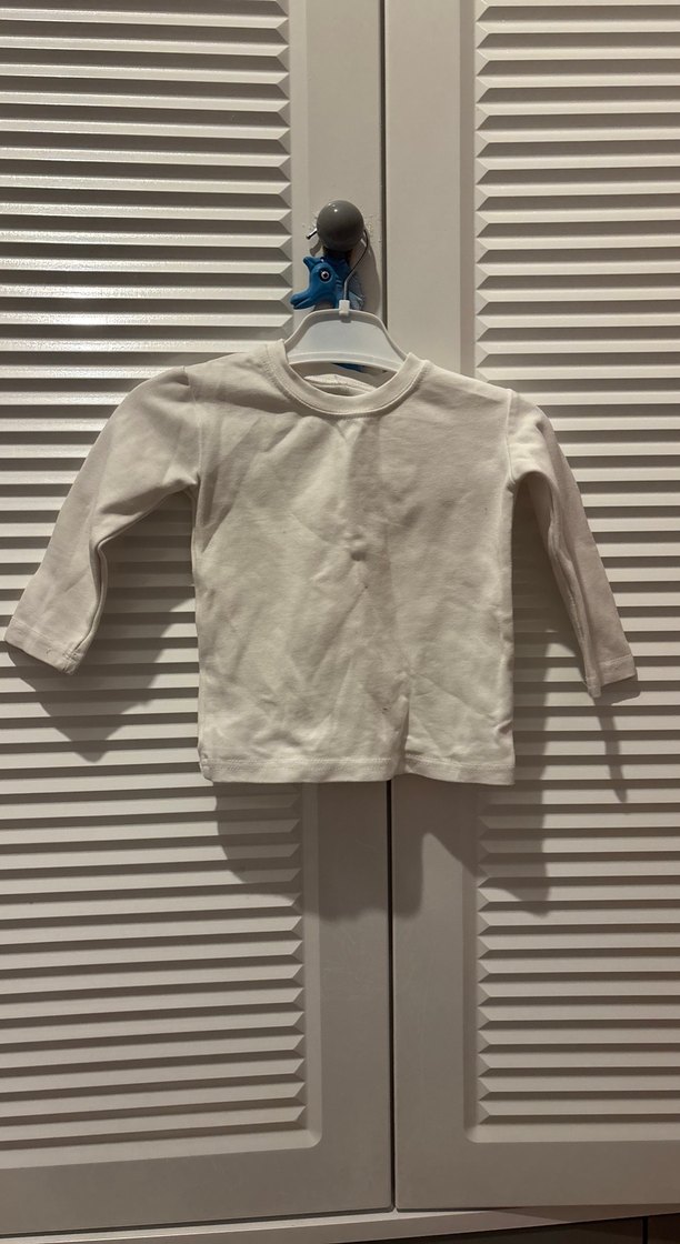 Beyaz renkte, uzun kollu ve desensiz çocuk içliği, yumuşak ve rahat bir kumaştan üretilmiştir. Küçük lekesi var