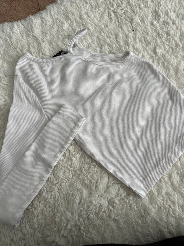 Pamuklu, beyaz uzun kollu crop top, yuvarlak yaka ve bol kesimle rahat ve sade bir günlük tarz sunar.