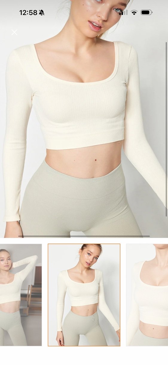 Düz bej crop top, uzun kollu ve düz yakalı, düz sentetik kumaştan. Spor ve günlük kullanım için trend normcore stil sunar.