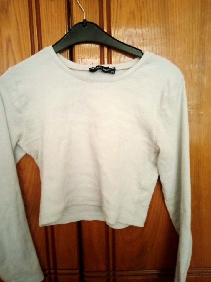 Pamuk kumaştan, bisiklet yaka ve uzun kollu beyaz crop top, günlük sokak stili için uygun, vücuda oturan kesime sahip.