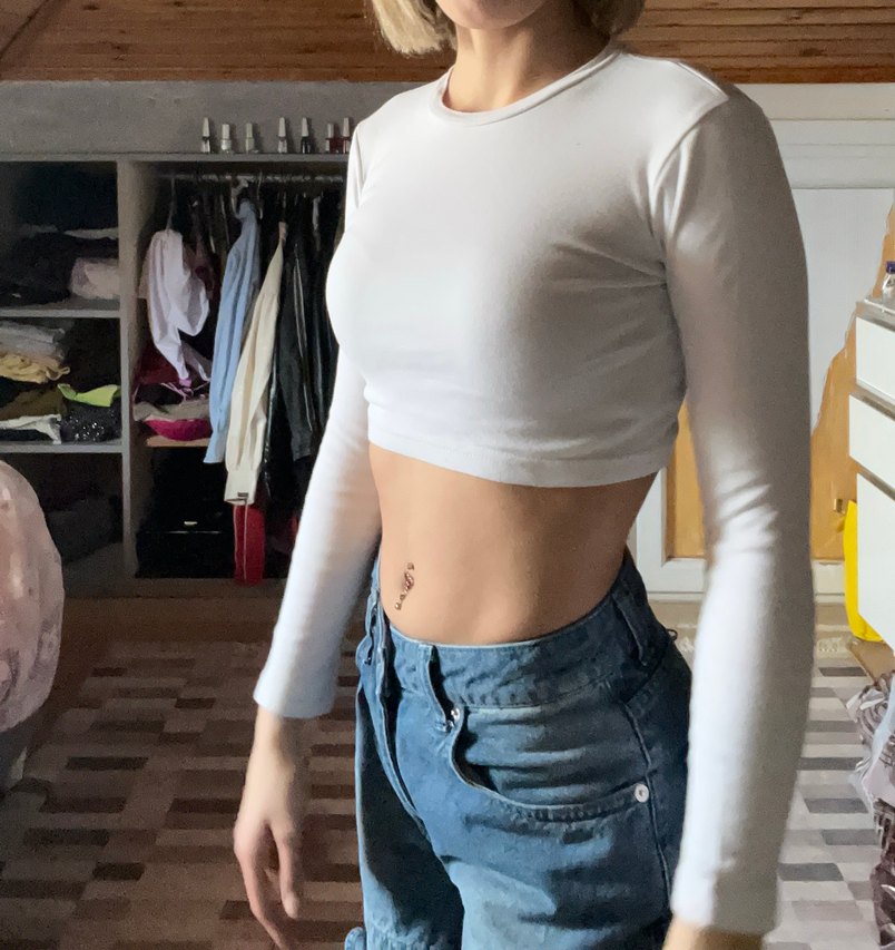 Beyaz, uzun kollu, crop top. Yumuşak denim kumaştan, rahat ve şık sokak tarzı. Günlük kullanıma uygun. kolunda ufak tefek boya lekeleri var