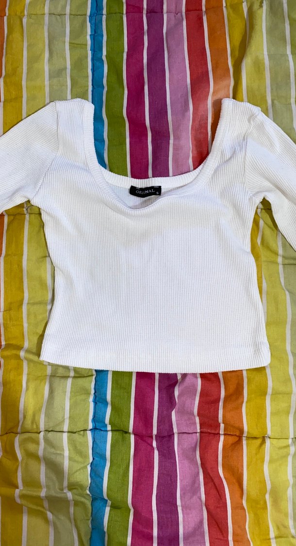 Beyaz uzun kollu crop top, kayık yaka ve pamuklu yumuşak kumaştan yapılmıştır. İnce kesimi ve normal boyu ile minimalist sokak stili için uygundur.