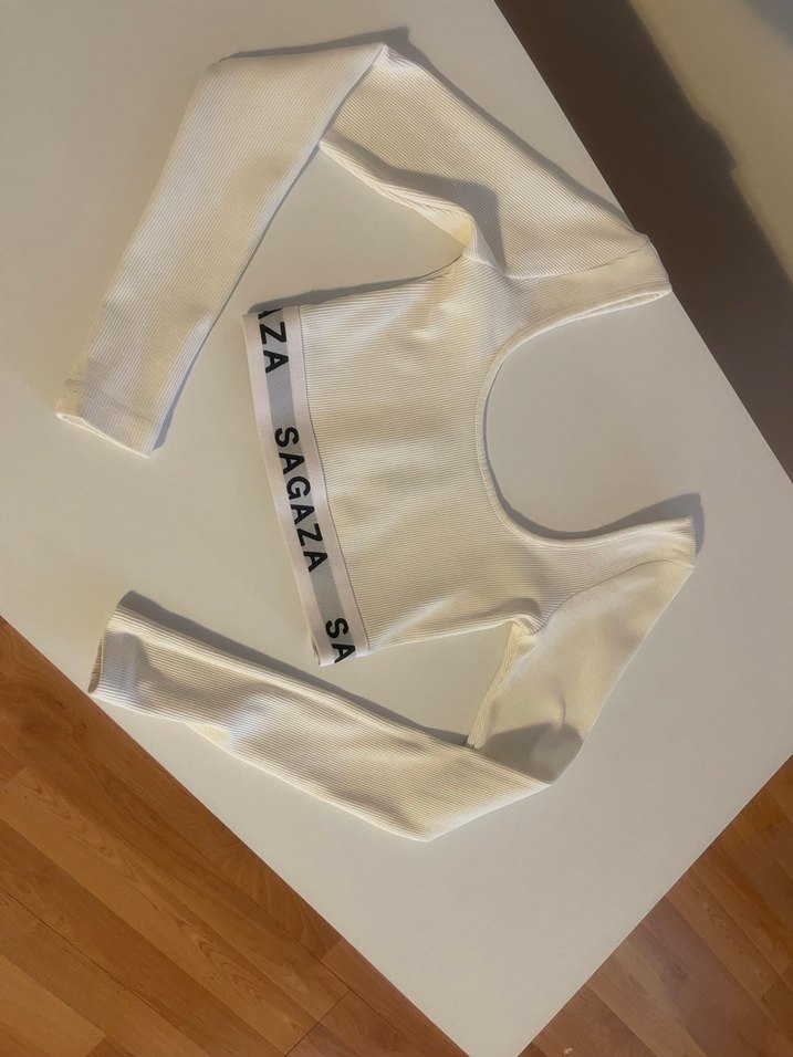 Uzun kollu, tek renk beyaz crop top. Elastik sentetik kumaştan, 'SAGAZA' baskılı bant detaylı, kısa kesim.1 defa kullanıldı orijinal sorunsuz.