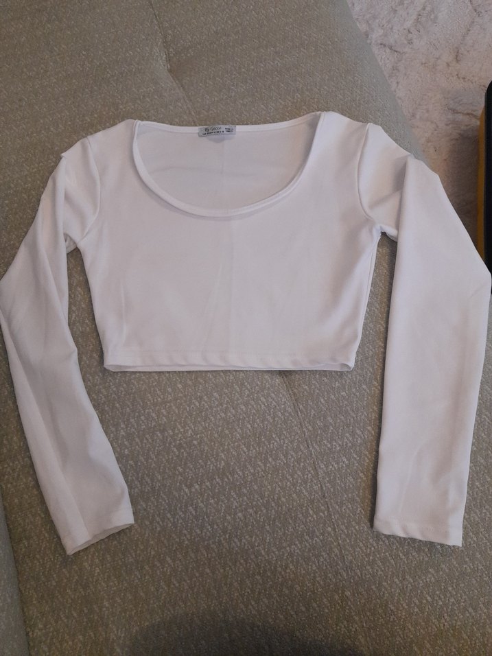 Pamuk kumaştan beyaz, uzun kollu, yuvarlak yakalı crop top. Vücuda oturan kesimi ve normal boyu ile günlük sokak stiline uygun.