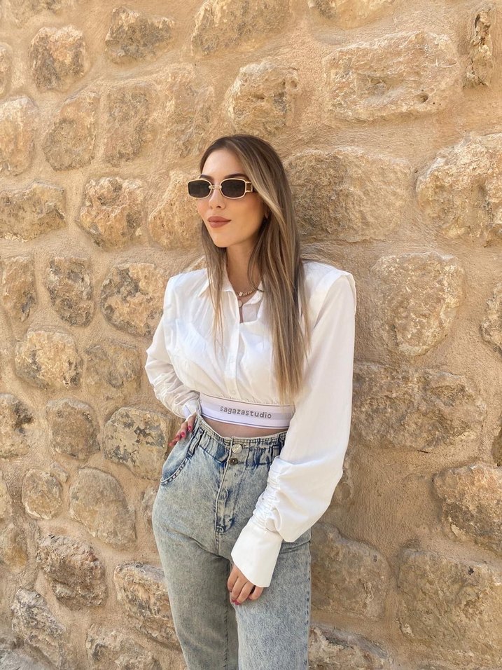 Beyaz, uzun kollu ve yakalı crop top, rahat kesim ve açık renk denim batik desene sahip. Günlük dış mekan kullanımı için şık ve rahat bir parça.