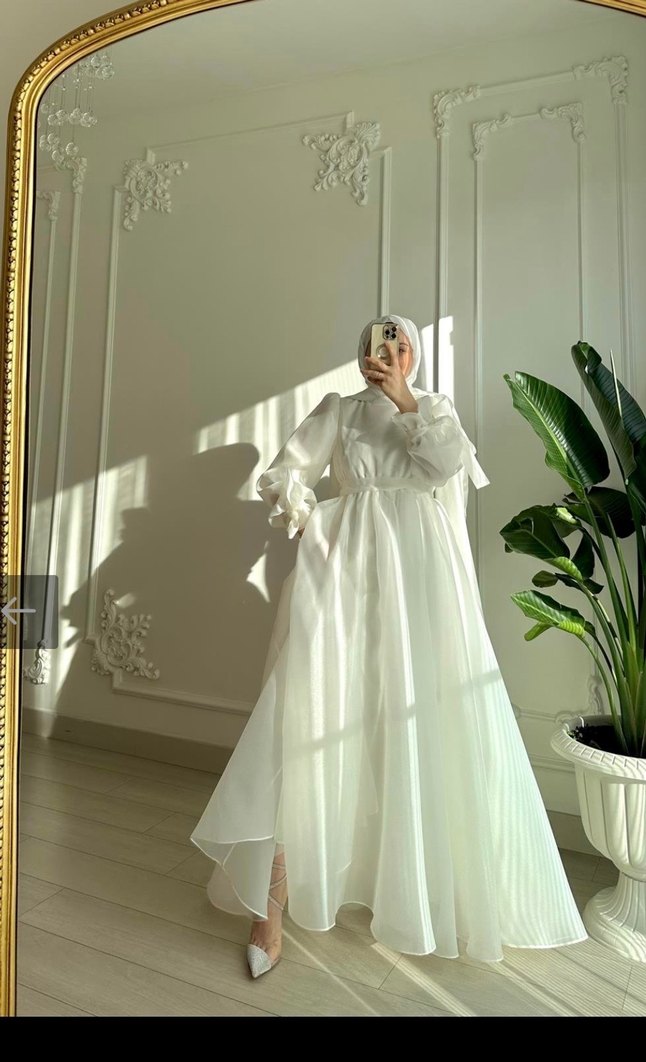 Beyaz uzun kollu, dökümlü tasarıma sahip bu kadın abiye, yüksek yakalı ve bol kesimdir. Minimalist ve modern klasik tarzda, düğünler ve nikahlar için uygundur. Şalı dahildir.