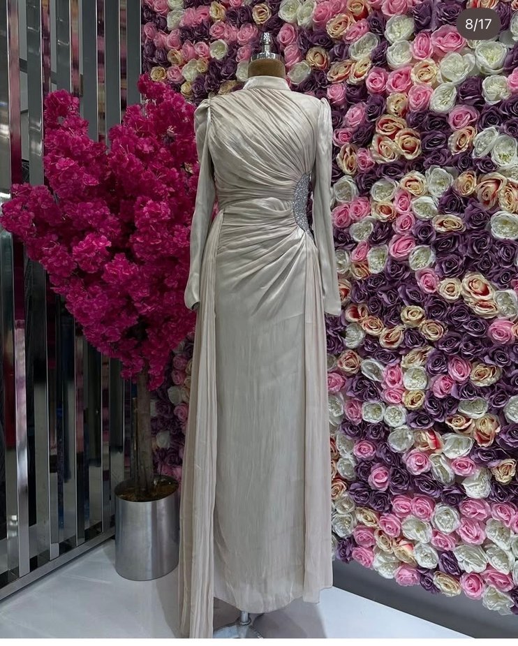 Beyaz Uzun Kollu Drapeli Abiye Elbise
