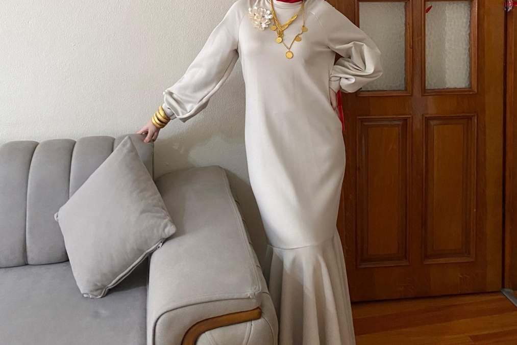 Beyaz Uzun Kollu Drapeli Kadın Elbise