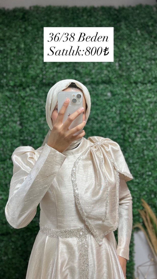 Yüksek yakalı, uzun kollu ve drapeli detaylı beyaz kına elbisesi, etnik desenli ve modern tarzda, 36/38 beden olarak sunulmaktadır.