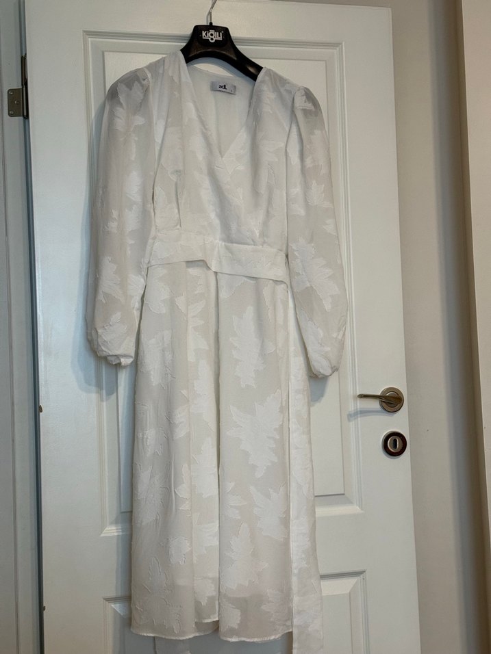 Beyaz renkte, uzun kollu ve yakası kesimli bu uzun elbise, salaş kesimi ve drapeli tasarımıyla hafif tie-dye desenine sahip. Sentetik kumaştan, ofis kullanımı için uygun.