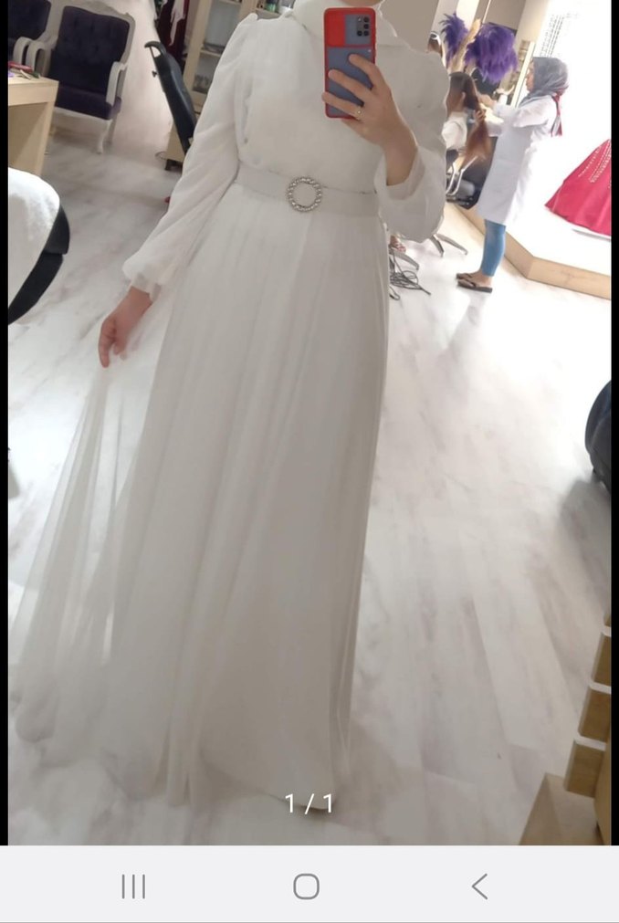 Beyaz uzun kollu, tek renkli, yumuşak sentetik kumaştan, bol kesim drapeli ve kemerli uzun elbisedir. Düğünler için uygundur. Nikahta bir kere giyildi. 38 bedendir. Elbiselerin kemerinde sarı lekeler vardır.