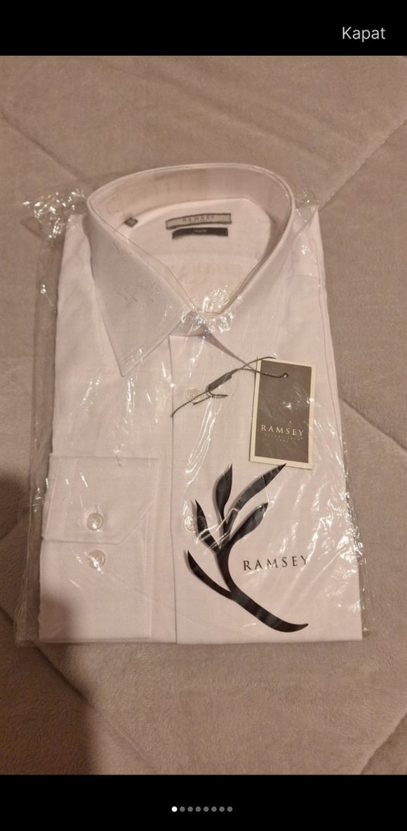 Uzun kollu, yakalı ve düğmeli beyaz erkek gömleği. İpek gibi kumaştan, baskılı desene sahip, ofis ve günlük sokak modasına uygun. Marka: Ramsey.