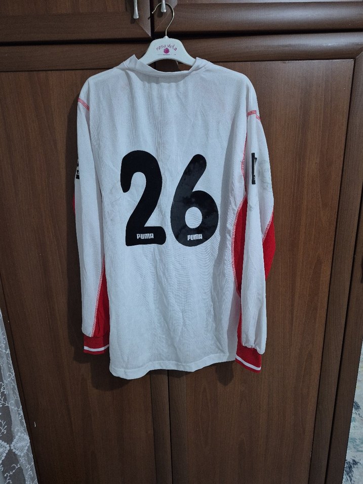 Beyaz, uzun kollu, düğmeli ve baskılı 26 numaralı rahat kesim erkek spor tişörtü, yumuşak ve sıcak kumaştan. malatyaspor forma uzun kollu lekeler ve izler var