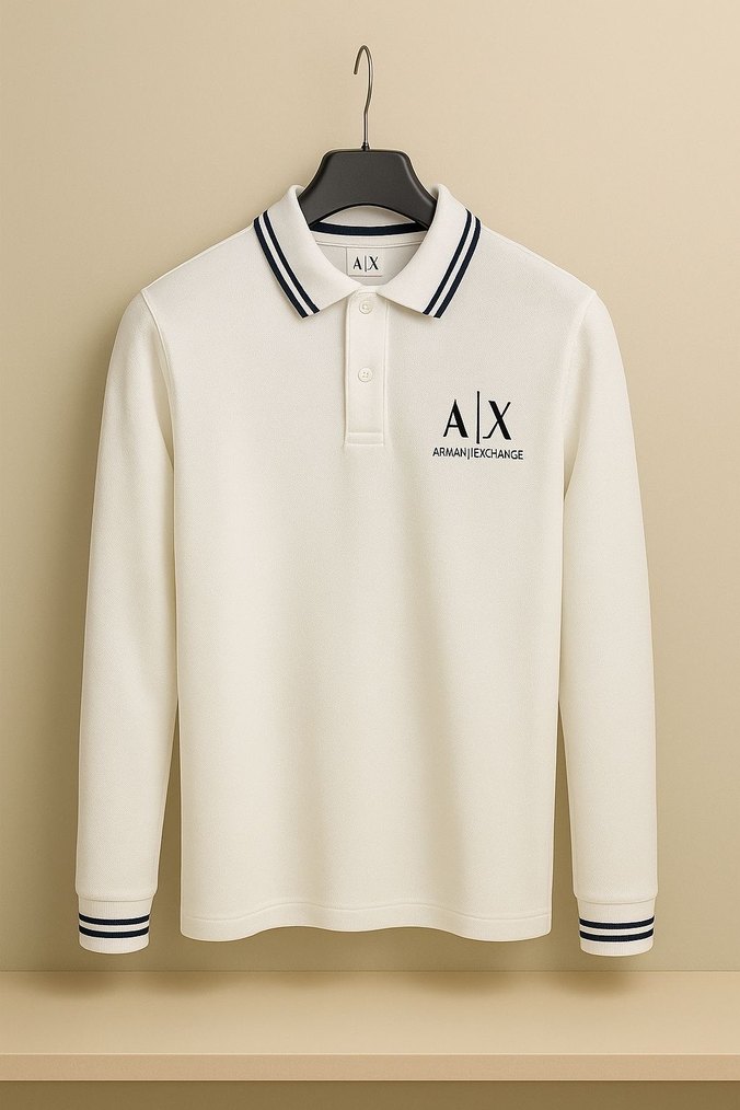 Beyaz uzun kollu, polyester kumaştan yapılmış ve AX baskılı, rahat günlük kullanım için uygun bir sweatshirt.