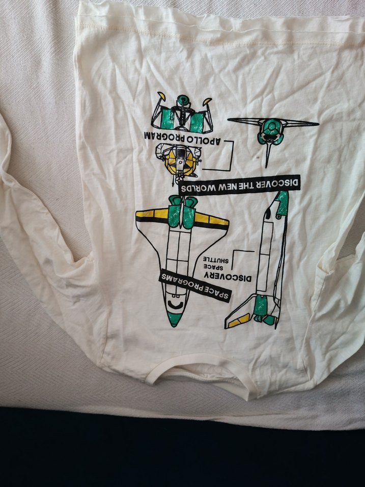 Beyaz uzun kollu erkek tişörtü, rahat kesim ve yuvarlak yakaya sahip. Renkli uçak desenleriyle süslenmiş, yumuşak tekstil kumaştan üretilmiştir. ✈️