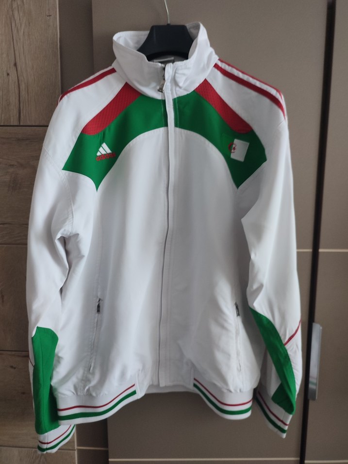 Beyaz, yeşil ve kırmızı baskılı, uzun kollu, fermuarlı ve dar kesim kadın eşofman üstü. Yumuşak ve sıcak kumaştan, sportif günlük kullanıma uygun.