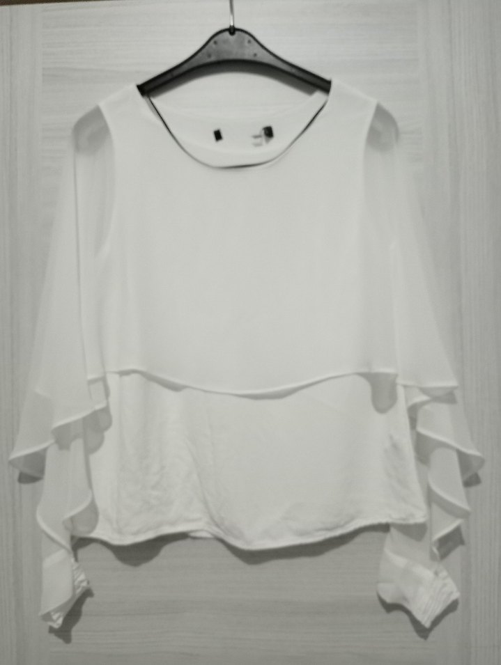 Beyaz, yuvarlak yaka, uzun kollu, bol kesim ve fırfırlı detaylara sahip bluz. Yumuşak sentetik kumaştan, günlük kullanım için minimal ve sokak stili uyumlu. ✨