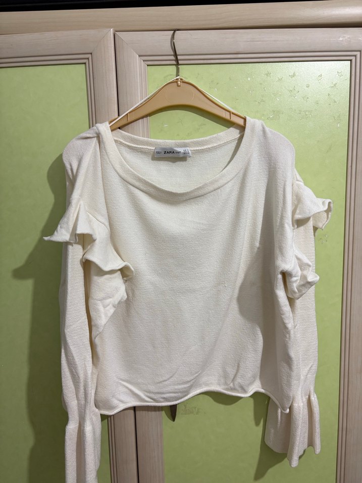 Beyaz kumaştan, uzun kollu ve fırfır detaylı, yuvarlak yaka salaş kesim bluz. Günlük rahat sokak tarzına uygun.