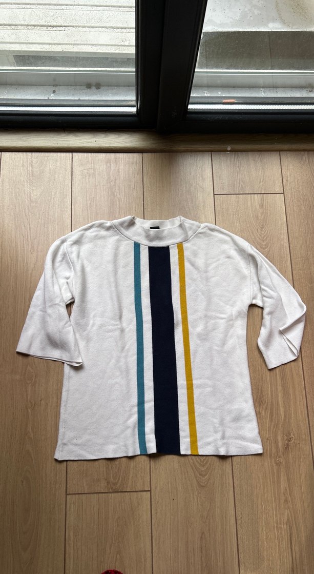 Beyaz pamuklu uzun kollu, yuvarlak yakalı, gevşek kesim kazak. Mavi, siyah ve sarı dikey çizgilerle gündelik kullanıma uygun rahat stil sunar.
