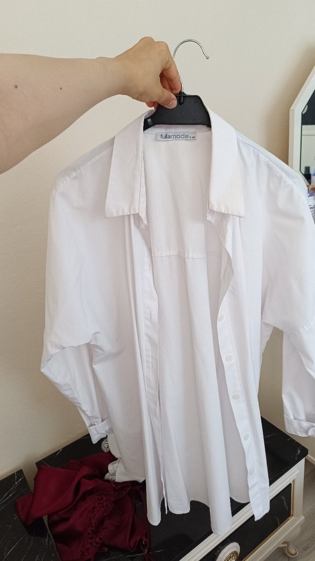 Beyaz gömlek, yakalı ve düğmeli. Bol kesim, uzun kollu ve hafif parlak dokusu ile ofis veya sokak stiline uygun.